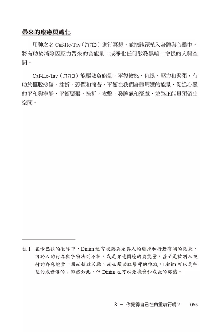 72神之名具有非常特定的能量振動,當我們透過觀想將神之名注入自身的能量場時,就會讓我們內在的能量有所變化。隨著內在能量振動的轉化,就會在我們內在產生健康和平衡的能量,而這些內在能量會逐漸共振到外顯層面,例如身體、情感、心理等等狀態,最後在物質層面產生實質性的變化。因此就算不會希伯來文,也可以將神之名看作是72組圖文符號,只要凝視某個神名,並將祂內化置入意識中,就會產生巨大的能量。在本書附錄中,作者提供了冥想引導的方法、觀想部位與操作等等細節,喜歡冥想的讀者可加以運用,也可以自行錄製冥想引導音檔,讓自己更容易進入冥想,去感受神之名的能量。