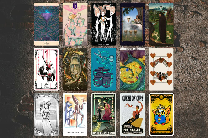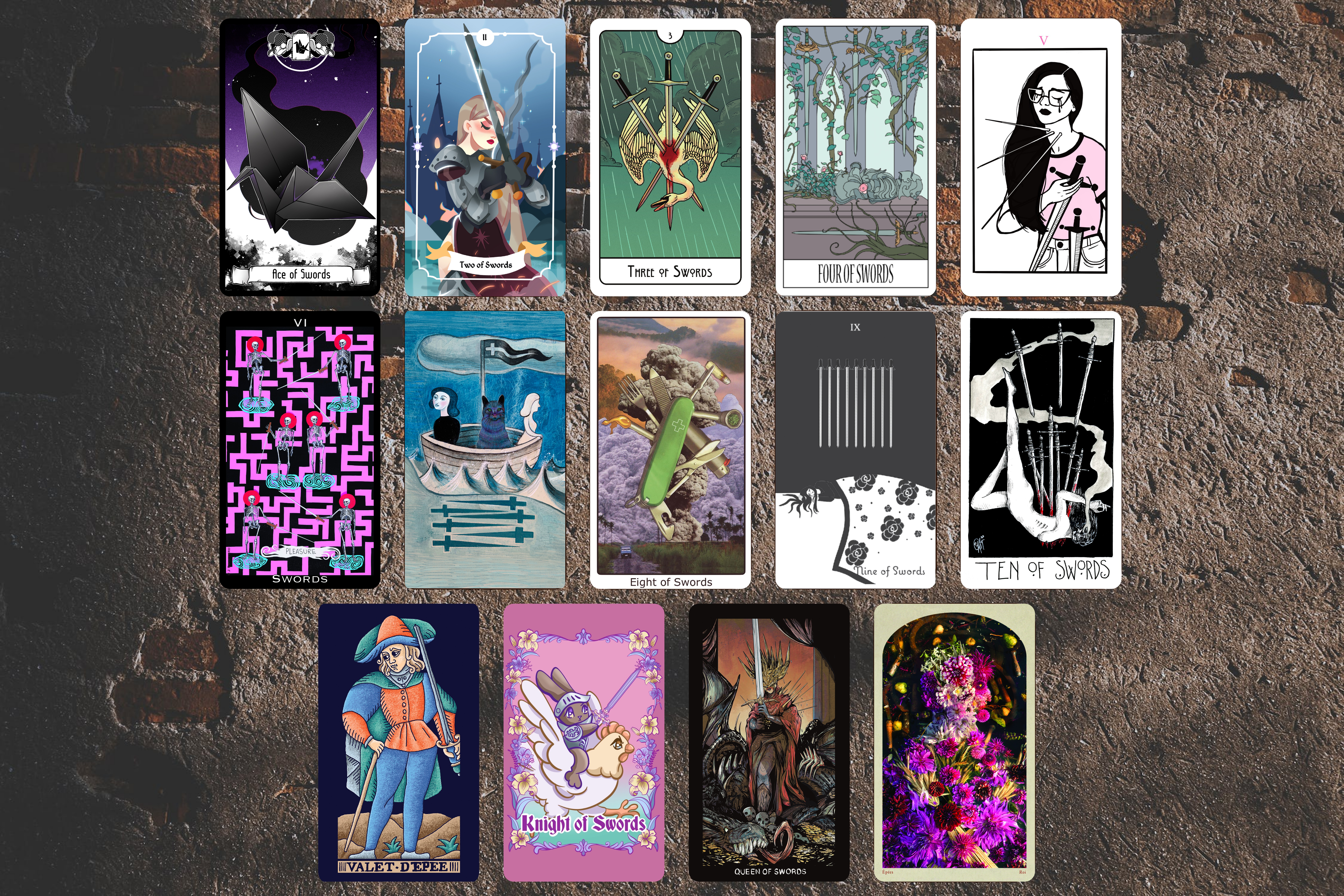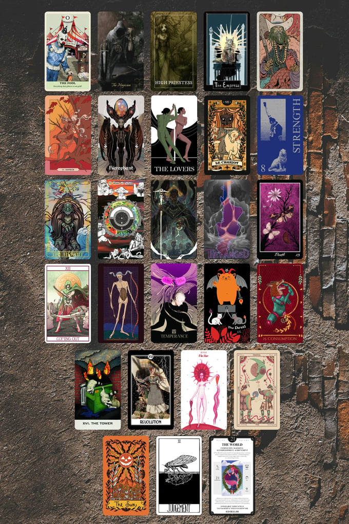 Each deck is made up of cards licensed from their original decks, cards made of art licensed from artists, or original art made just for this deck. A full listing of credit for each card can be found throughout the project, separated out by deck, including links to their work and where you can purchase the original decks.