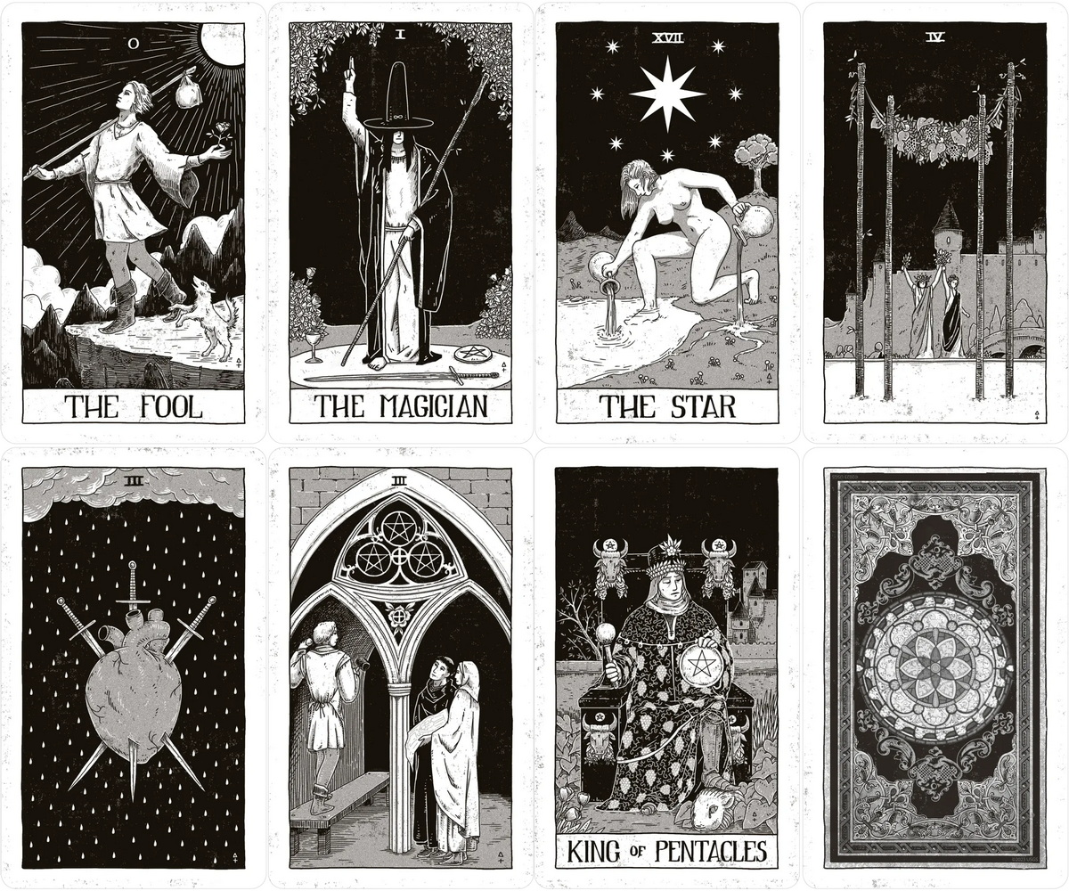 Using only black ink, the Black Ritual Tarot invites us to explore the depths of the psyche. Adam Zonca’s highly detailed illustrations offer a monochromatic perspective on the enduring Rider-Waite archetypes and symbols. This black and white deck was created to offer focused readings that cast light on the dark and light aspects within our journey and ourselves. Includes 78 cards and 56-page booklet with card meanings and keywords.