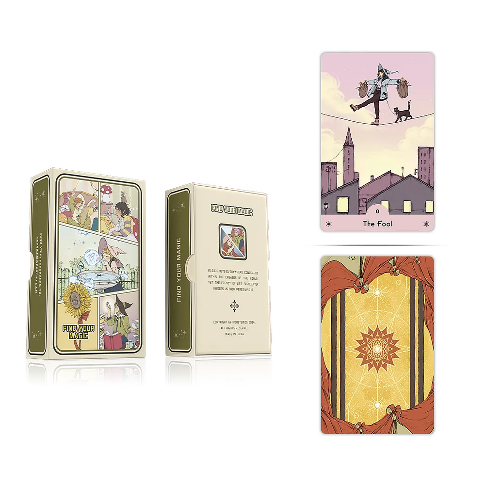 WohStudios has official licensing rights from the publisher to produce authorized print editions of the Find My Magic Tarot Deck. Concurrently, the printing process has been upgraded to enhance overall quality. The cards are manufactured using imported black-core paper, feature air-layer lamination, and utilize eco-friendly water-based and oil-based inks, resulting in a smoother tactile experience.