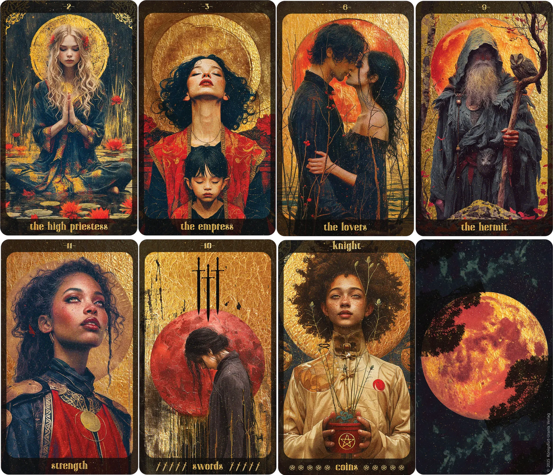 Welcome to the magical universe of the Amber Moon Tarot! These beautiful cards combine the magic of tarot, the feminine energy of the moon, and the radiant beauty of amber. The vibrant, expressive illustrations let you dive into a unique world full of enchantment, emotion, and vast landscapes.
