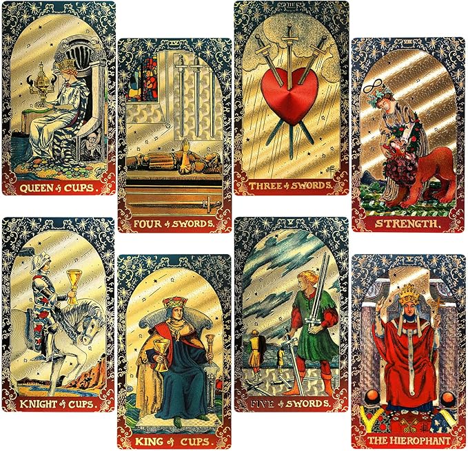 【Durable, Waterproof, and Wrinkle Resistant】Made from durable high-grade PVC, this tarot deck is a little bit thicker than ordinary PVC cards, offering better resistance to bending and creases. The waterproof material protects the cards from water damage, and the slightly textured surface makes shuffling easy and comfortable. The gold foil design adds a luxurious and atmospheric touch, making the deck highly collectible.
